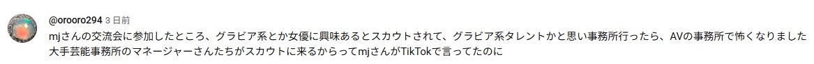mjさんの交流会に参加したところ、グラビア系とか女優に興味あるとスカウトされて、 グラビア系タレントかと思い事務所行ったら、AVの事務所で怖くなりました 大手芸能事務所のマネージャーさんたちがスカウトに来るからってmjさんがTikTokで言ってたのに
