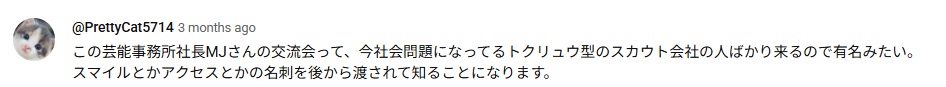 この芸能事務所社長MJさんの交流会って、 今社会問題になってるトクリュウ型のスカウト会社の人ばかり来るので有名みたい。 スマイルとかアクセスとかの名刺を後から渡されて知ることになります。